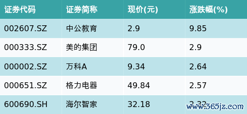 截至收盘,超级品牌主题涨跌幅最高的五只股票为:中公教育(002607.SZ)、美的集团(000333.SZ)、万科A(000002.SZ)、格力电器(000651.SZ)与海尔智家(600690.SH)。详情见下表: