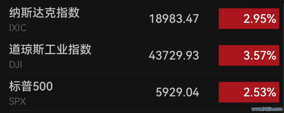 当地时间11月6日周三,美股三大股指集体大涨。截至收盘,道指涨3.57%,纳指涨2.95%,标普500指数涨2.53%。三大股指收盘均创历史新高。